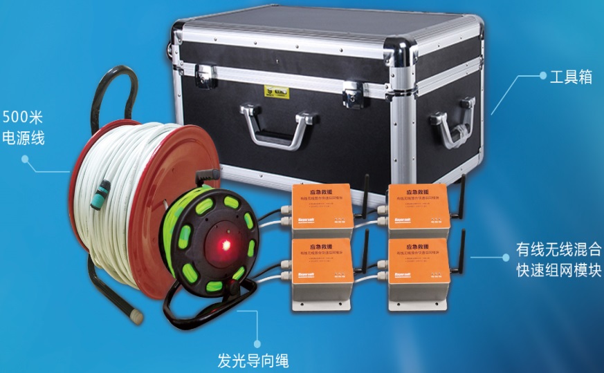 3.救援现场在没有4G网络覆盖的矿井、山谷、隧道、地震灾害等应急救援时,实现快速组网通讯,完成指挥调度工作。采用电力网通信技术快速组建通信网络,与救生通讯安全导向绳结合,解决在救援现场最后一公里范围内通信的难题。无需其他设备,快速组网通讯模块自带语音对讲,可与单兵、布控球、手机互联回传高清视频。可为救援现场可能用到的切割机手钻等需要供电的其他工具设备持续供电。